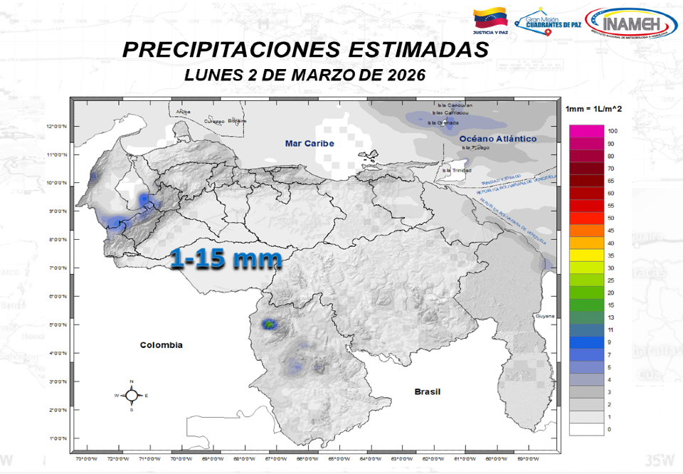 Lluvias o lloviznas al sur de Bolívar/Amazonas, montañas de Miranda, oeste de Barinas y este de Mérida.